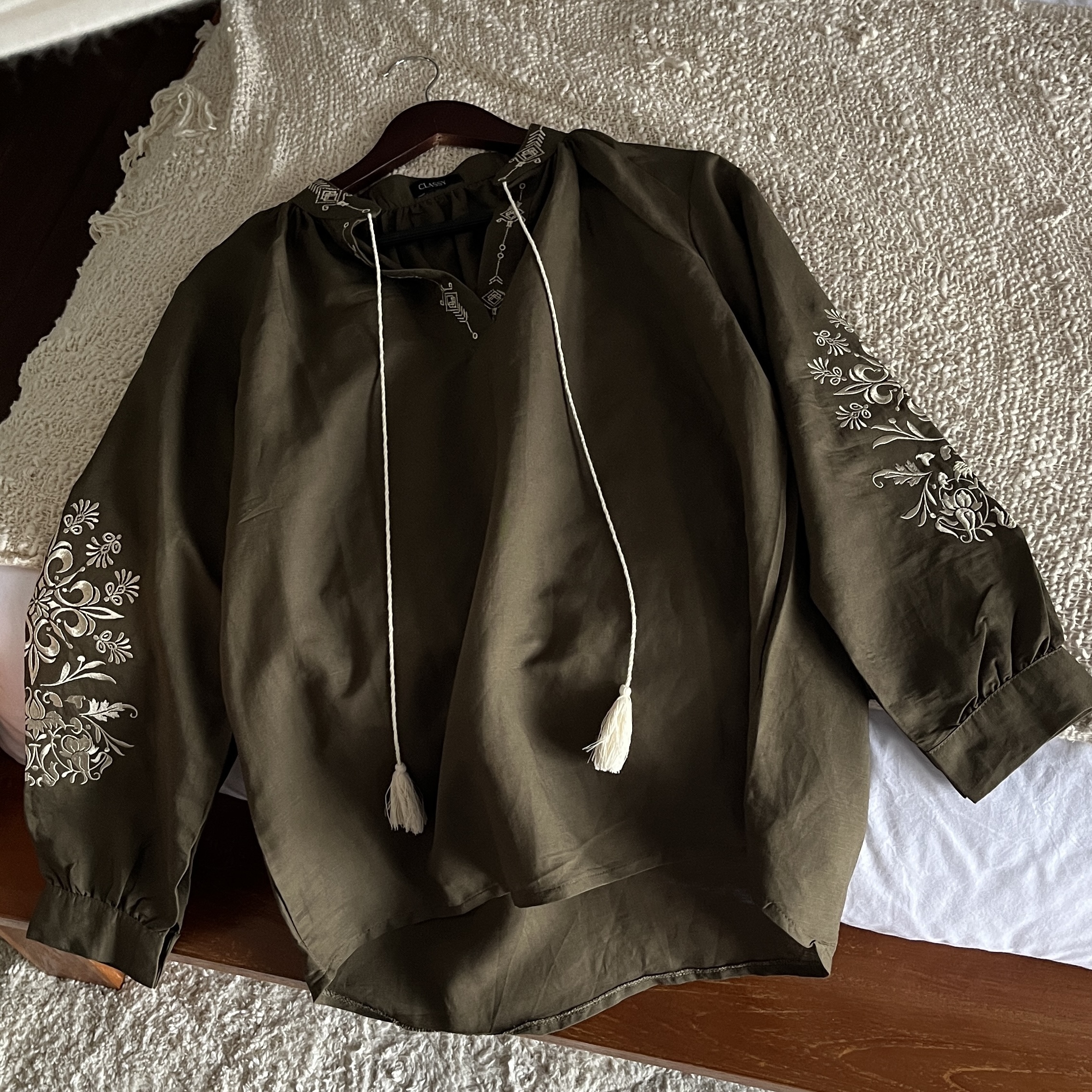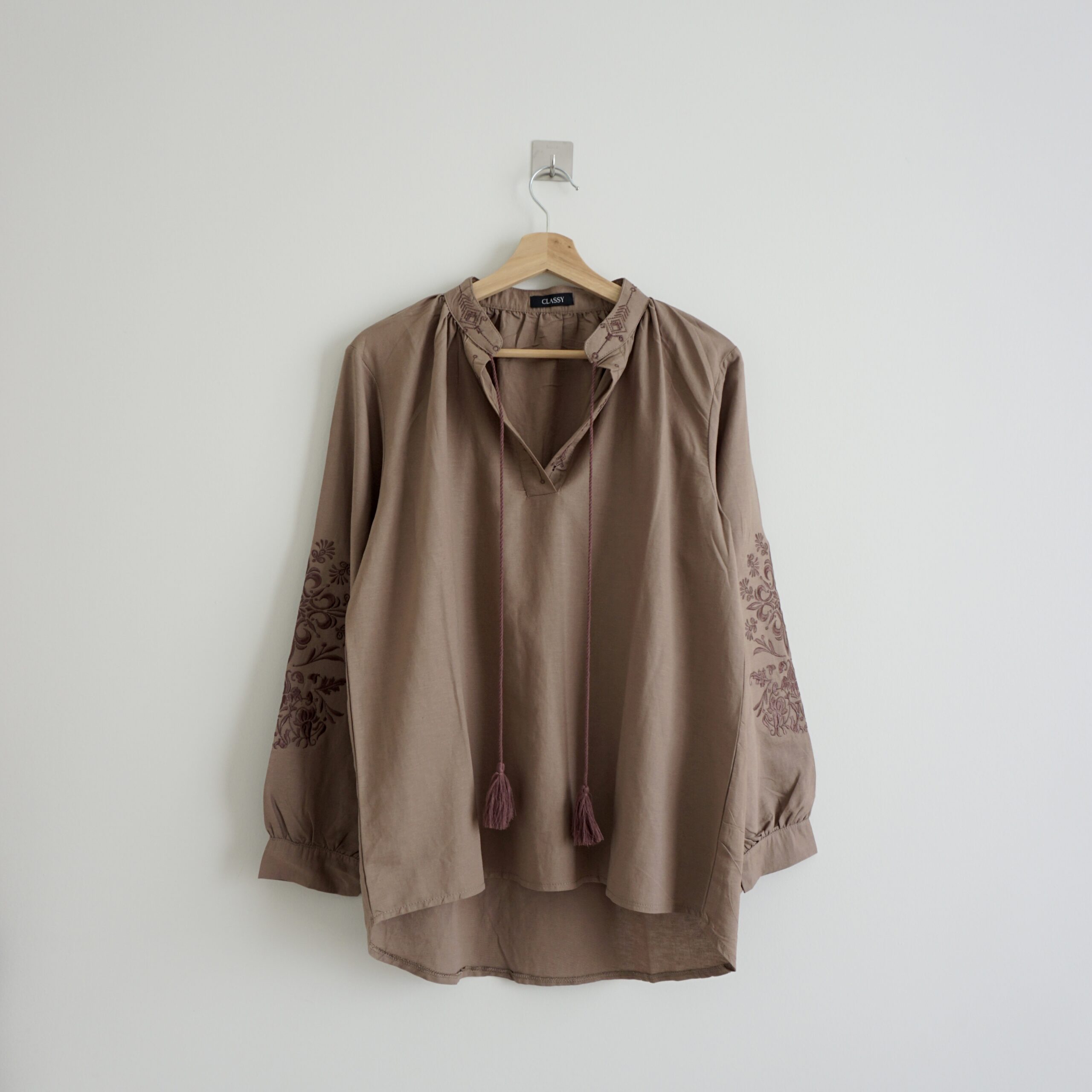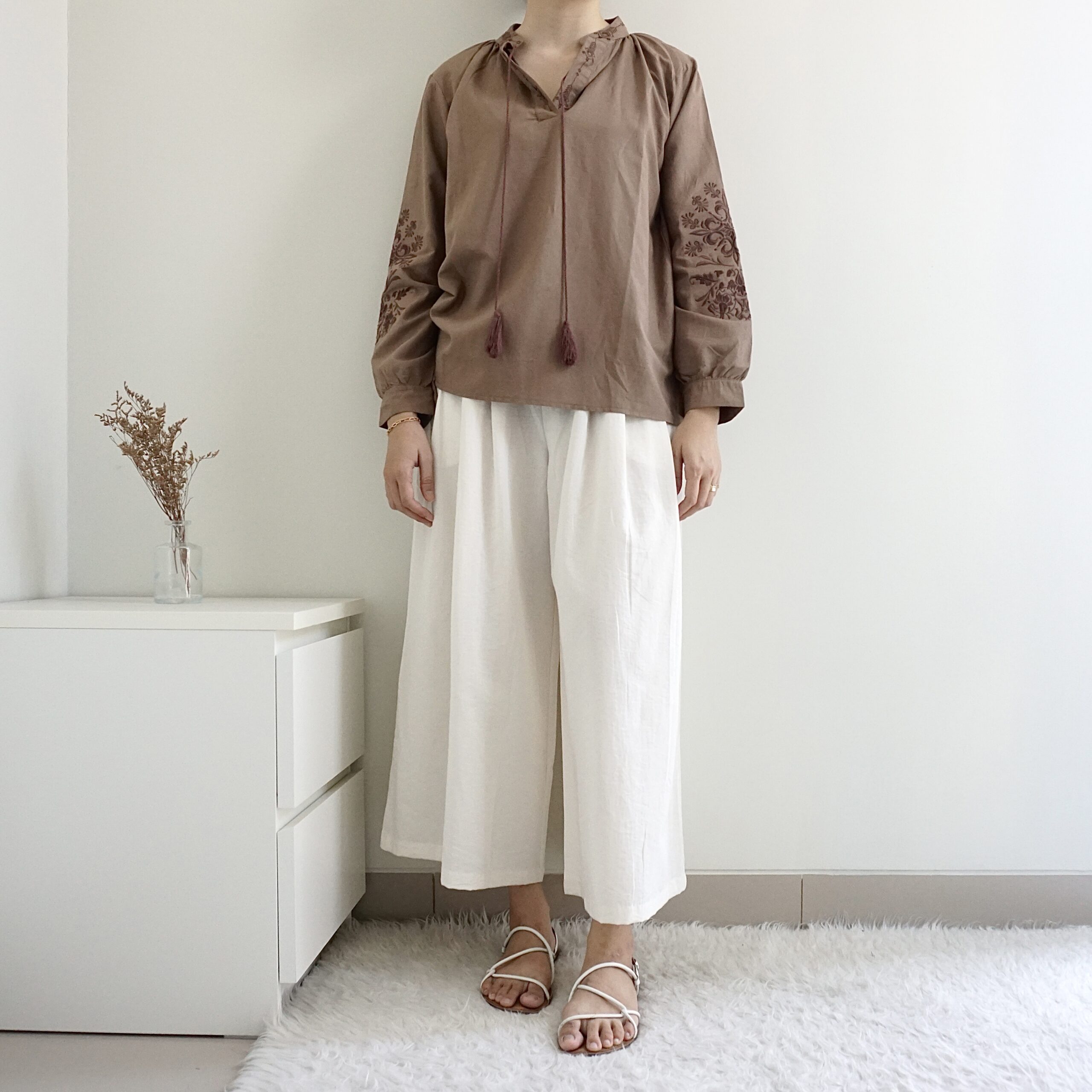 Atasan berbahan linen premium dengan aplikasi bordir di leher dan lengan. Tersedia dalam 2 pilihan warna: Olive dan Créme.
